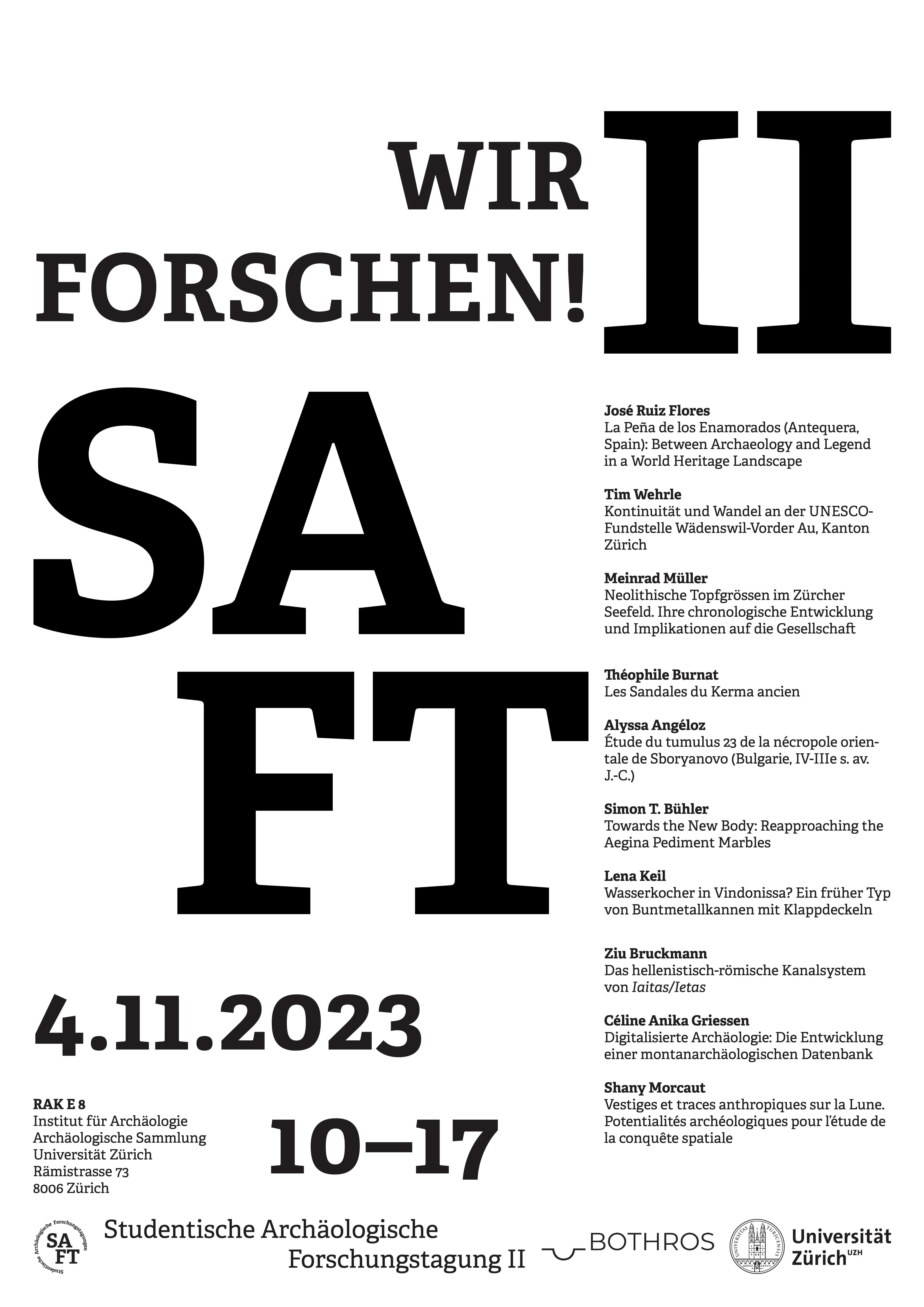 Im Rahmen der 2. Studentischen Archäologischen Forschungstagung (SAFT II) wird Studierenden verschiedener archäologischer Disziplinen der Universitäten Basel, Bern, Genf, Neuenburg und Zürich unter dem Motto «Wir Forschen!» eine Plattform geboten, um ihre Qualifikationsarbeiten einem interessierten Publikum vorzustellen. Ziel ist der Austausch von Wissen und Erfahrungen, der wissenschaftliche Diskurs sowie die Vernetzung von Studierenden der Archäologie aus der ganzen Schweiz.