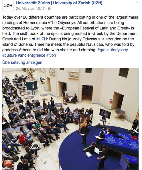 Öffentliche Rezitation von Buch 6 der Odyssee im altgriechischen Original im Rahmen von „Odyssée 24“ des „Festival Européen Latin Grec“ (24.3.2017, Lichthof UZH)