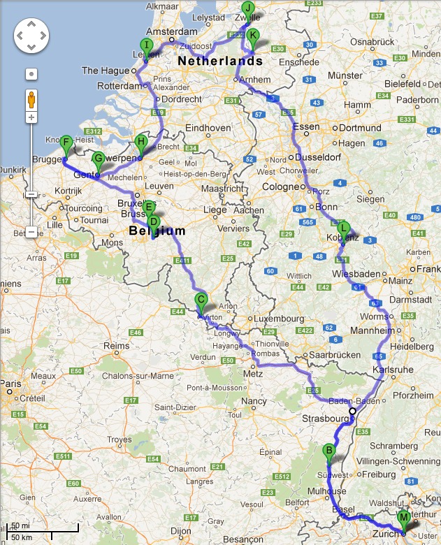 Unsere Route: Zürich - Murbach - Colmar - Orval - Oignies (bei Charleroi) - Villers-Kloster - Gent - Brugge - Antwerpen - Leiden - Zwolle - Deventer - Maria Laach - Boppard - Zürich: